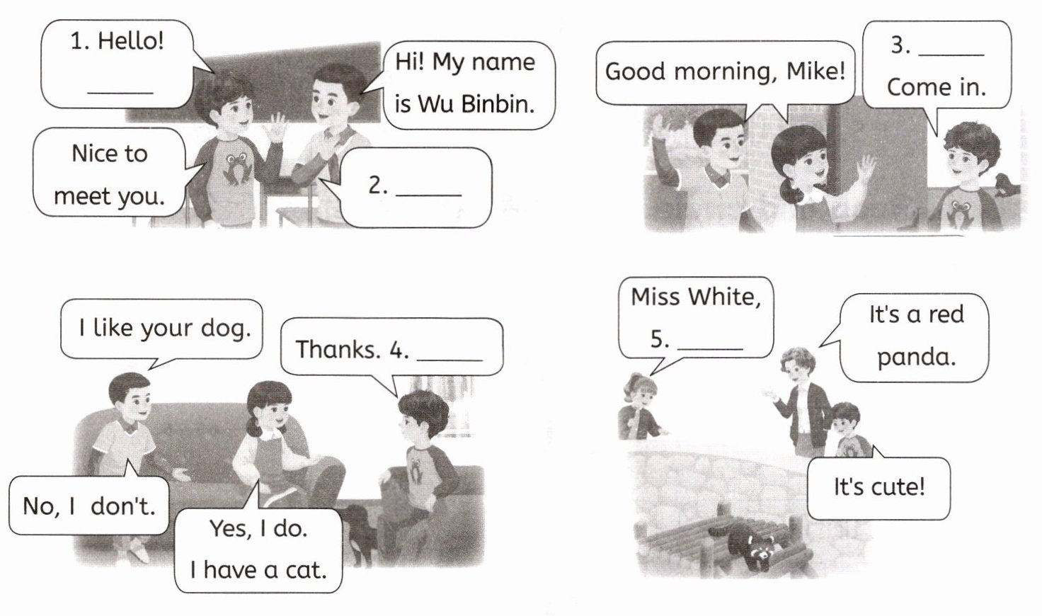 Ⅸ. Read and choose.(丁零零,预备铃声响起,课前热身游戏开始了。请读图,从方框中选择合适的句子补全对话,将标号填写在横线上。)