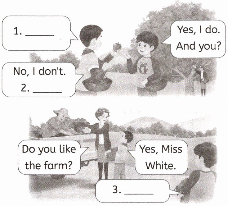 Ⅲ. Read and choose.(大家互相交流采摘的感受。请读图,从方框中选择合适的句子补全对话,将标号填写在横线上。)