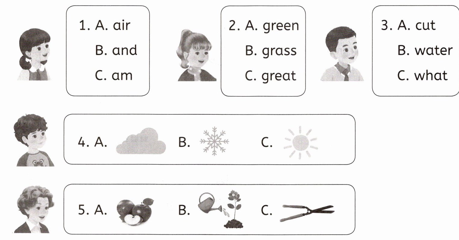 Ⅰ. Listen and circle. (经过同学们一段时间的照料,校园里的植物生长得越来越旺盛,快来听听大家的经验分享吧!听录音,选出与录音内容对应的单词或图片,将选项圈出来。)