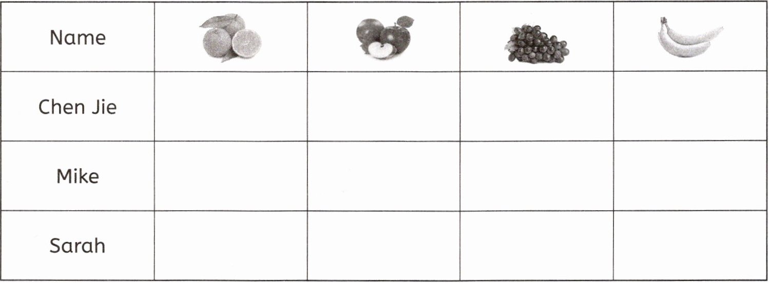 Ⅲ. Read and draw. (小伙伴们来到吴斌斌家看他的小树,吴斌斌准备了水果来招待伙伴们。请读一读,在人物喜欢的水果下面画笑脸。)