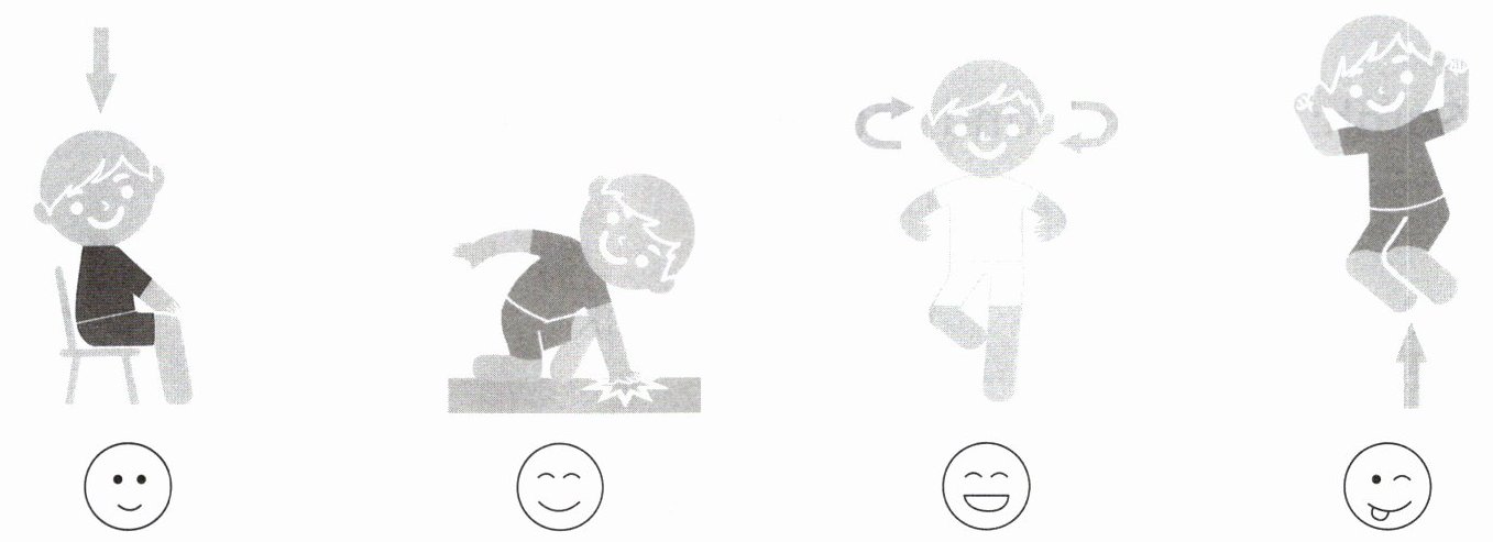 (同学们都画累了,大家一起做做游戏吧!请听录音,根据录音内容给笑脸涂色,然后参照图片做一做动作吧。)