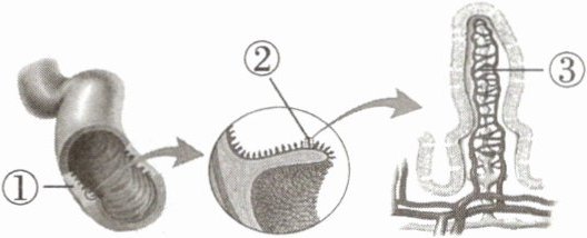 [分析]小肠长6 m左右,是人体最长的器官,利于消化和吸收,A项正确;图中①是环形皱襞,②是小肠绒毛,它们的存在使小肠的吸收面积达到$200 m^2$以上,B项正确;②是小肠绒毛,③是毛细血管,小肠绒毛内有毛细血管,绒毛壁、毛细血管壁、毛细淋巴管壁都是由一层上皮细胞构成的,有利于营养物质被吸收,与消化无关,C项错误,D项正确。