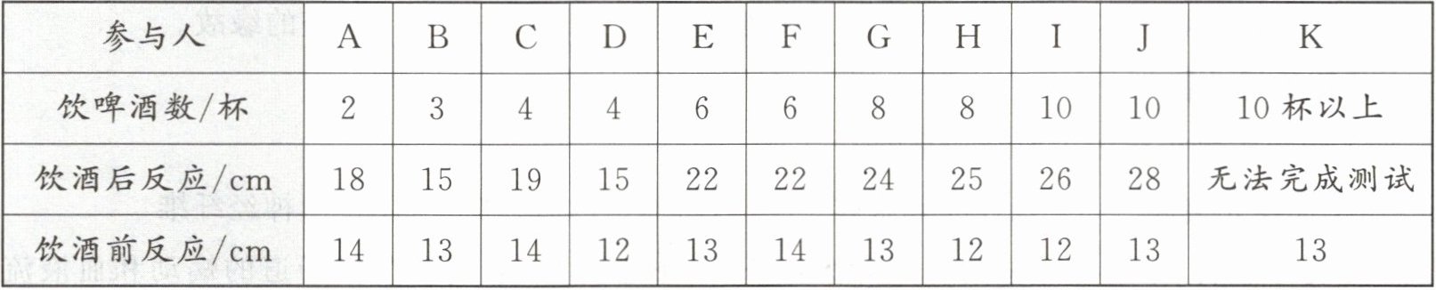 |饮酒后反应/cm|18|15|19|15|22|22|24|25|26|28|无法完成测试|