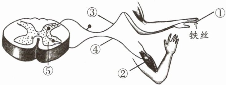 例 2 小涵在学做灯笼时,被铁丝扎到了手,迅速缩回了手。如图是缩手反射的反射弧结构模式图,则下列分析正确的是(