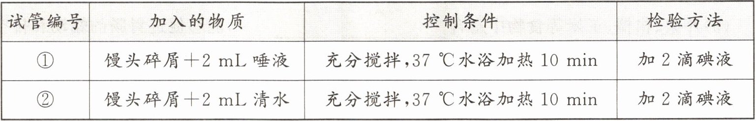 |②|馒头碎屑+2 mL清水|充分搅拌,37℃水浴加热10 min|加2滴碘液|