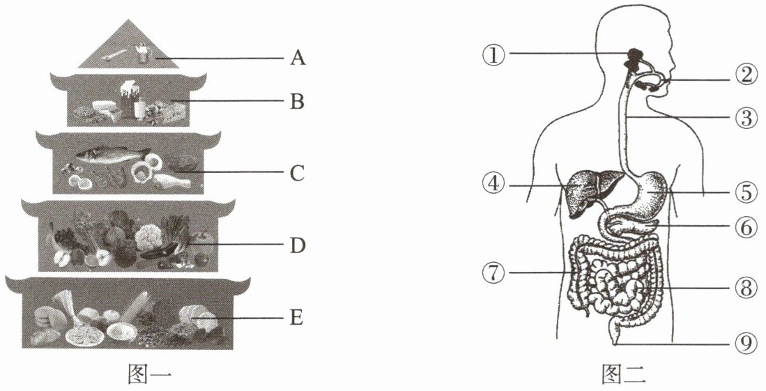 14. 图一是平衡膳食宝塔示意图,图二是消化系统模式图,请据图回答下列问题。