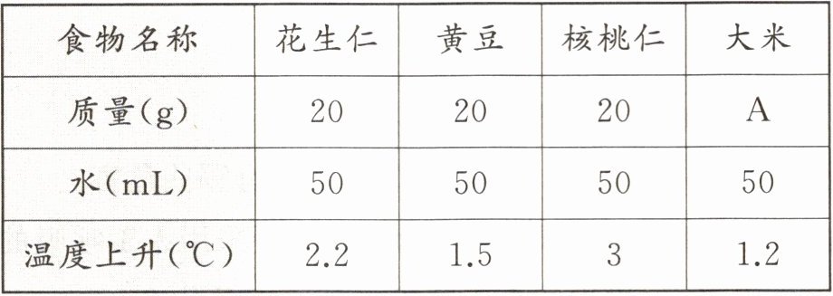 4. 食物的热价是指 1 g 食物氧化分解或在体外燃烧时所释放的热量。小明测定几种不同食物的热价,实验结果如表所示,以下说法中你不赞同的是(