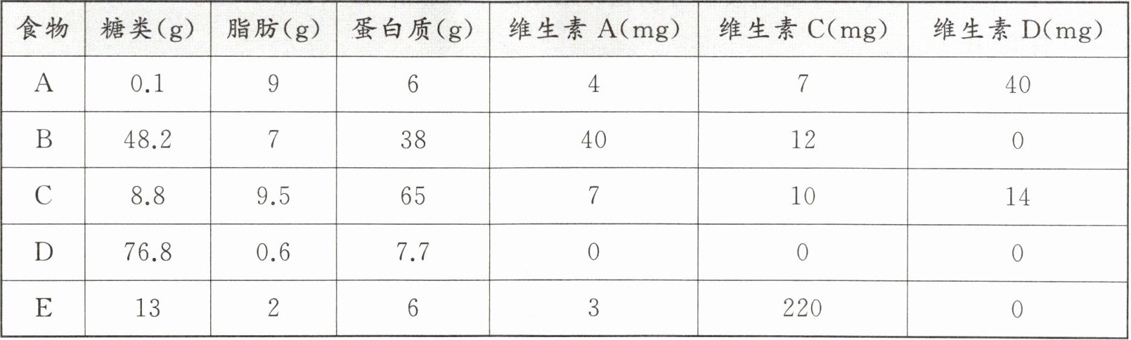 8. 下表列出了 A、B、C、D、E 五种食物(各 100 g)中除水和无机盐以外的主要成分。请据表回答下列问题。