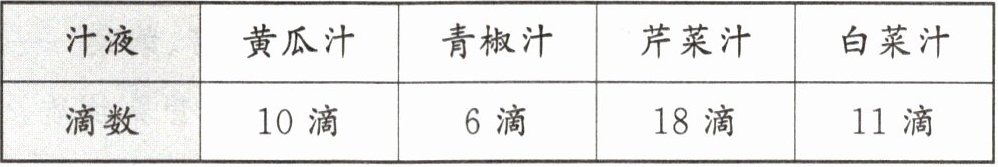 6. 为比较蔬菜中维生素 C 的含量,某同学根据维生素 C 可使 2,6 - 二氯酚靛酚溶液褪色的原理,设计了如下实验:在四支同样的洁净试管中分别加入 2 mL 相同浓度的 2,6 - 二氯酚靛酚溶液,然后用滴管分别向其中滴加新鲜的黄瓜、青椒、芹菜、白菜的汁液,直至完全褪色。观察结果如下表所示。据表可知,这四种蔬菜中维生素 C 的含量最少的是(