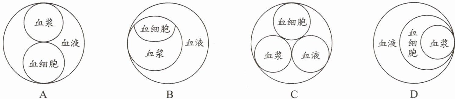 5. 下列四幅图中,能够正确表达血液、血浆、血细胞三个概念之间关系的是(