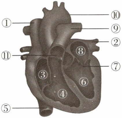 8. 心脏有规律地收缩和舒张,使血液在心脏和血管组成的管道中循环流动。如图是人的心脏内部结构示意图,请据图回答下列问题。