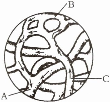 6. 图为小江用显微镜观察小鱼尾鳍内的血液流动情况,箭头表示血流方向,请据图回答下列问题。