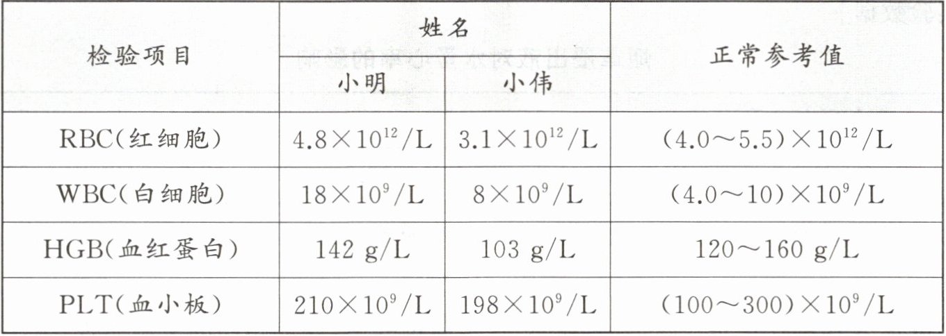 2.小明和小伟因身体不适到医院做了血常规检验,下表为两人血常规检验报告单的部分结果,有关叙述错误的是(
