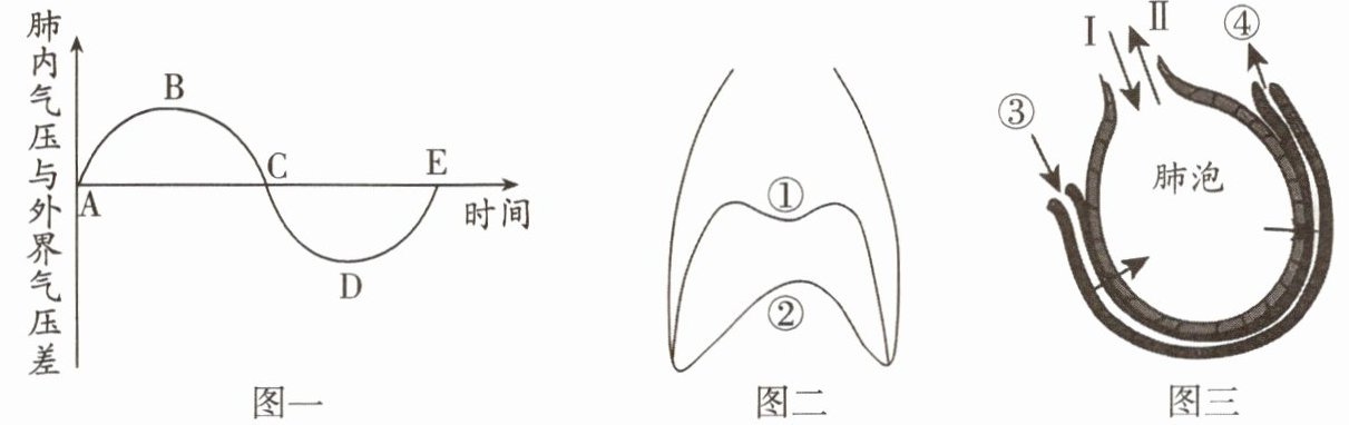 )B.图一中 $C \to D$ 段表示肺内气压逐渐减小,此时人体处于吸气状态