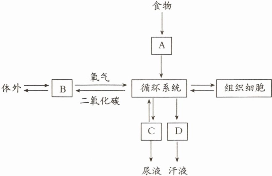 24.(每空 1 分,6 分)人体是一个统一整体,各器官、系统之间存在着密切的联系。如图是人体的某些生理活动示意图,图中 A、B、C、D 分别表示系统或器官,请据图回答下列问题。