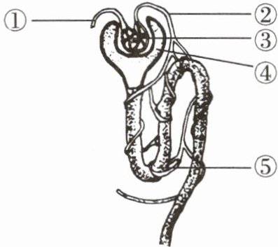 [分析]①是入球小动脉,②是出球小动脉,③是肾小球,④是肾小囊,⑤是肾小管。肾单位由肾小体和肾小管组成,肾小体由肾小球和肾小囊组成,因此,肾单位包括③④⑤,A 项正确;入球小动脉与出球小动脉内都流动脉血,B 项正确;肾小囊腔内为原尿,含葡萄糖,C 项错误;肾小管具有重吸收作用,D 项正确。