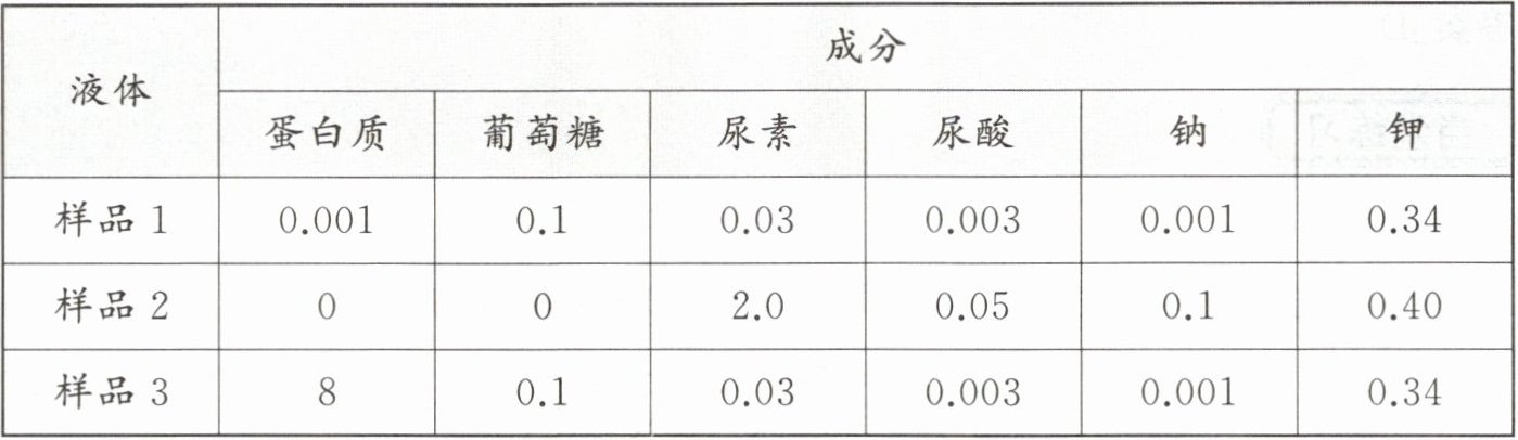 5. 从人体得到三种液体,其内不同物质的成分及含量(g/100 mL)见下表,分析推断它们依次来自(