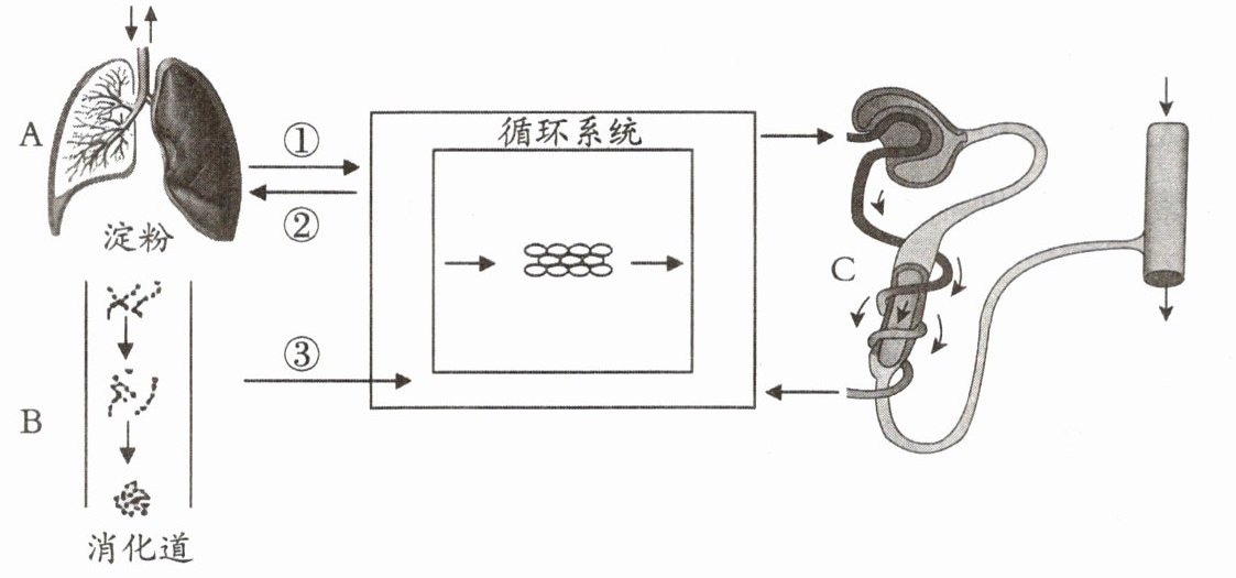 12. 人体是一个统一的整体,需不断从外界获取物质和能量并排出废物,以维持生命活动的正常进行。如图为人体内部分生理活动的示意图,其中A、B、C表示系统,①②表示物质,③表示生理过程。