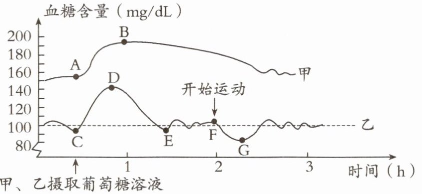 [分析]胰岛素的主要功能是通过调节糖在体内的吸收、利用和转化,如促进血液合成糖原,加速血糖的分解,从而降低血糖浓度。人体内胰岛素分泌不足时,血糖合成糖原和血糖分解的作用就会减弱,结果会导致血糖浓度升高而超过正常值,一部分血糖就会随尿液排出体外,形成糖尿。糖尿是糖尿病的特征之一。通过图示可知,甲为糖尿病患者,其血糖浓度较正常人明显偏高,注射胰岛素可促进血糖合成糖原,加速血糖的分解,使甲血糖含量变化曲线下移,A 项正确;AB 段变化的原因是摄取葡萄糖溶液,血糖含量升高,而不是因为胰岛素分泌不足,B 项不正确;人摄取葡萄糖溶液后,刚获得了糖类等营养物质,因此血糖含量升高(AB、CD),这时人体内的胰岛素分泌增加,来调节糖的代谢,促进血糖合成糖原,加速血糖的分解,从而降低血糖浓度(DE),使血糖维持在正常水平。DE 段变化的原因是胰岛素分泌增多,C 项正确;F 点乙开始运动,运动过程中组织细胞进行呼吸作用,消耗血液中的葡萄糖,因此,血糖含量下降,即 FG 段变化的原因是组织细胞消耗较多葡萄,D 项正确。