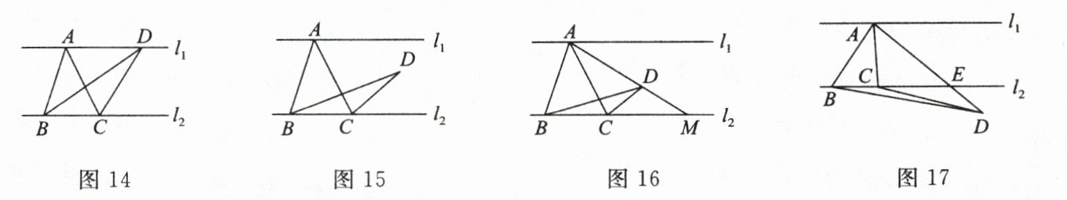 (2)如图 16,当点 $D$ 在 $l_{1}$,$l_{2}$ 之间时,连接 $AD$ 并延长,交 $l_{2}$ 于点 $M$,则 $\frac{S_{\triangle ABC}}{S_{\triangle DBC}}=\frac{AM}{DM}$. 请你证明这个结论.