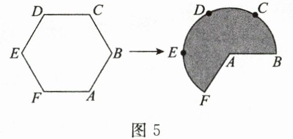 14. 如图5,将边长为3的正六边形铁丝框$ABCDEF$变形为以点$A$为圆心,$AB$为半径的扇形(忽略铁丝的粗细),则所得扇形(阴影部分)的面积为