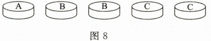 17. (16 分)小明与小亮共同发明了一种“字母棋”游戏,他们用三个字母做成如图 8 所示的 5 颗棋子(除字母外其他均相同),其中 A 棋 1 颗,B 棋 2 颗,C 棋 2 颗.制订规则如下:将 5 颗棋子放入 1 个不透明的袋子中,小明和小亮分别随机从中摸出 1 颗棋子,若摸到的 2 颗棋子中有 A 棋,则小明胜;若摸到 2 颗字母相同的棋子,则小亮胜(其余情况视为平局,游戏重新进行).