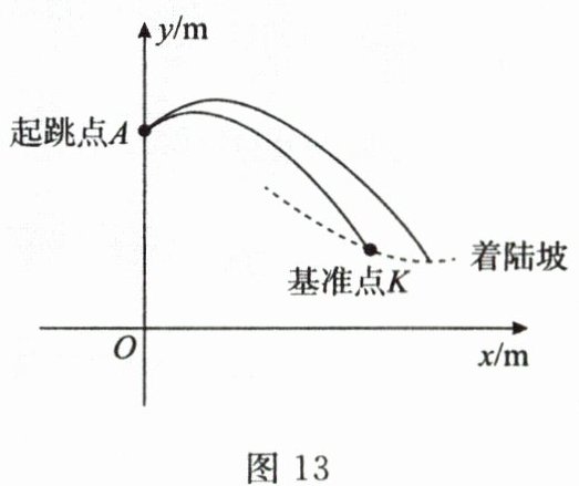 跳台滑雪可分为助滑、起跳、飞行和落地四个阶段,运动员起跳后飞行的路线是抛物线的一部分(如图13中实线部分所示).落地点在着陆坡(如图13中虚线部分所示)上,着陆坡上的基准点$K$为飞行距离计分的参照点,落地点超过点$K$越远,飞行距离分越高.某个跳台滑雪训练场的起跳台的高度$OA$为66m,基准点$K$到起跳台的水平距离为75m,高度为$h$m($h$为定值).设运动员从起跳点$A$起跳后的高度$y$(m)与水平距离$x$(m)之间的函数关系为$y = ax^{2}+bx + c(a\neq0)$.