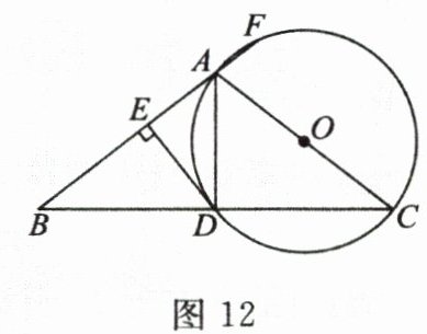 21. (10分)如图12,在$\triangle ABC$中,$AB = AC$,以$AC$为直径作$\odot O$交$BC$于点$D$,连接$AD$,过点$D$作$DE\perp AB$,垂足为点$E$,延长$BA$交$\odot O$于点$F$.