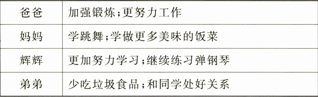制订新年计划对于提高和完善自我有着重要的意义。请根据下面表格的内容提示,写一篇英语短文,介绍一下辉辉一家的新年计划吧。