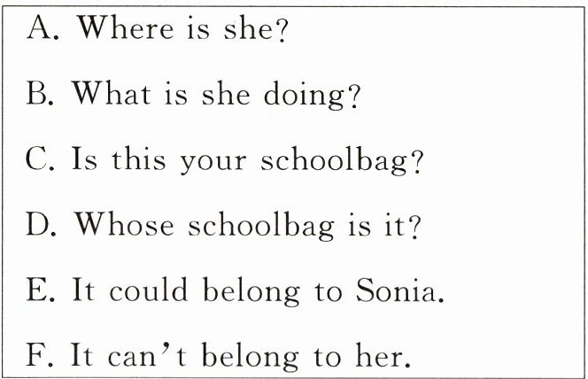 )Linda: I'm not sure. Maybe it's Kate's. She is looking for her schoolbag.