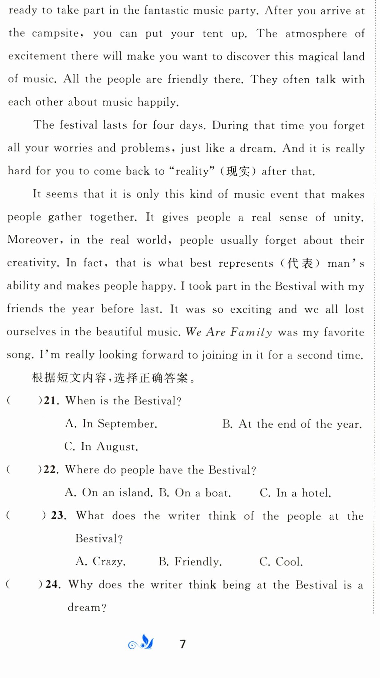)23. What does the writer think of the people at the Bestival?A. Crazy. B. Friendly. C. Cool.