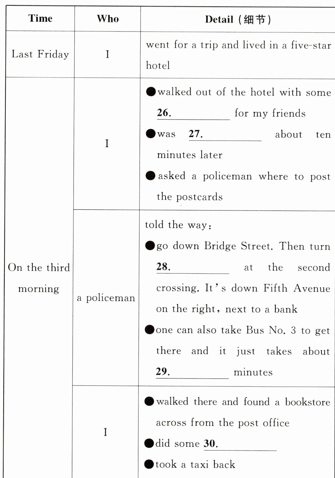 26.postcards 27.lost 28.left 29.ten / 10 30.reading