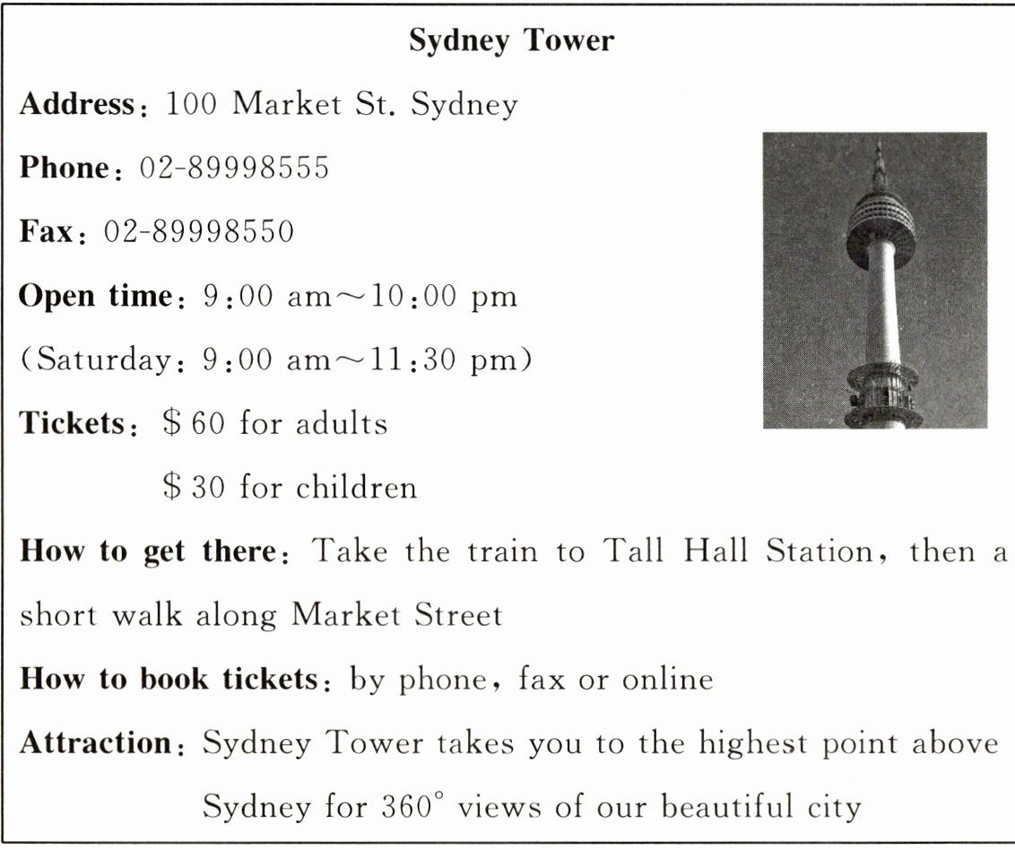 )16. Sydney Tower opens at _________ every day.A. 9:00 am B. 11:00 pm C. 11:30 pm