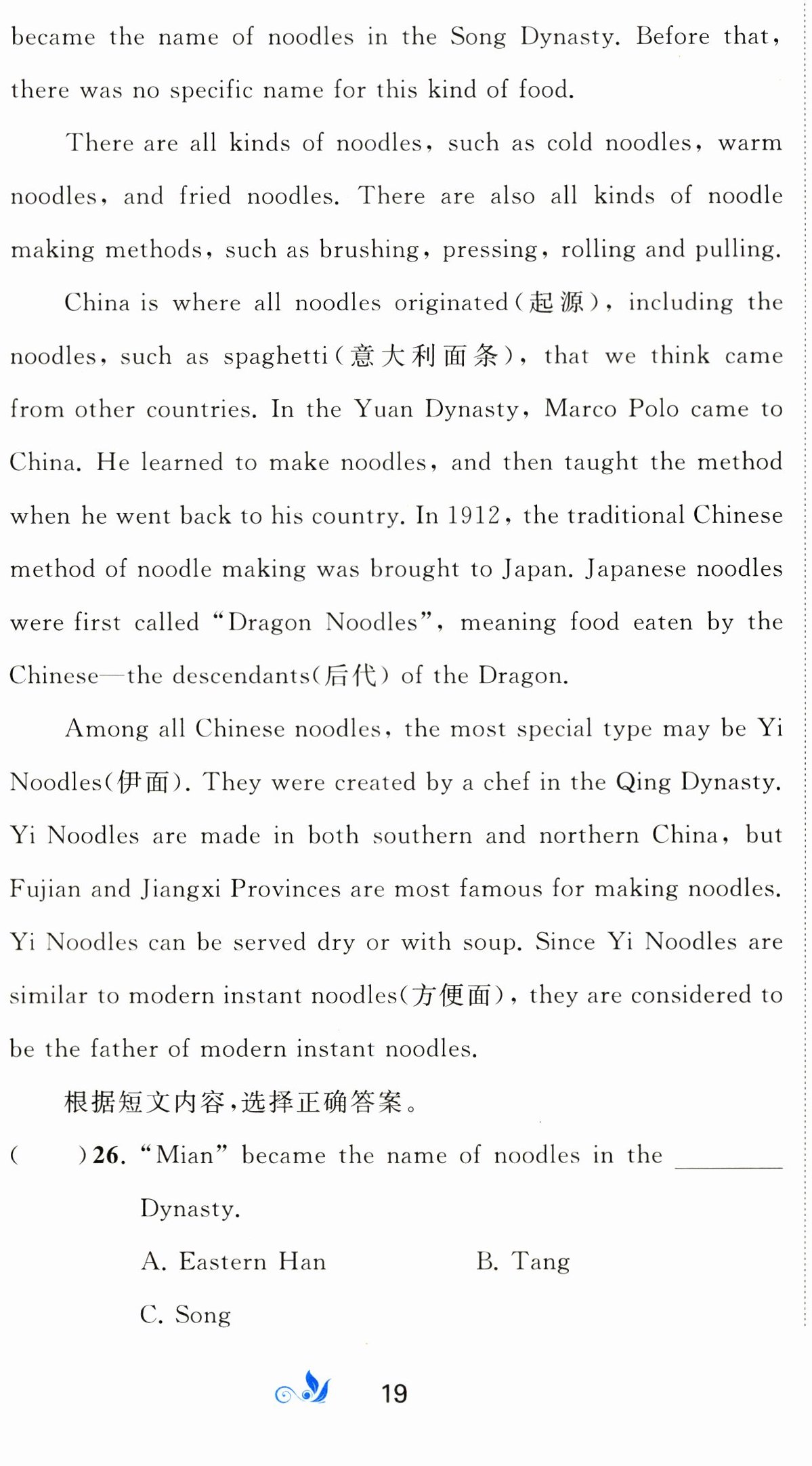 )27. Which of the following is TRUE?A. There are only two kinds of methods of noodle making. B. Marco Polo came to China in the Yuan Dynasty. C. Japanese noodles are more famous than Chinese noodles.