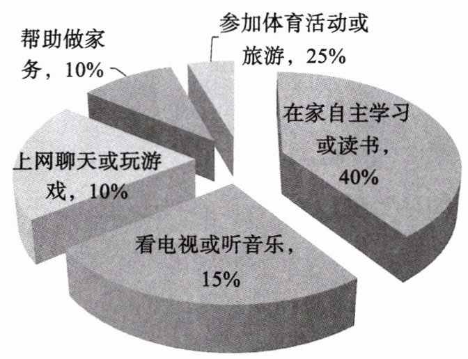 I find that 40% of the students study by themselves at home or read some books. About 25% of them go in for sports or travelling. 15% of them prefer to watch TV or listen to music. 10% of them like to chat online or play computer games,while 10% of them help their parents do housework. We should make good use of our time, learning more knowledge as well as developing our hobbies. But I don't think it's a good idea to spend too much time watching TV, chatting online or playing computer games. For our health, it's necessary to spend more time outdoors.