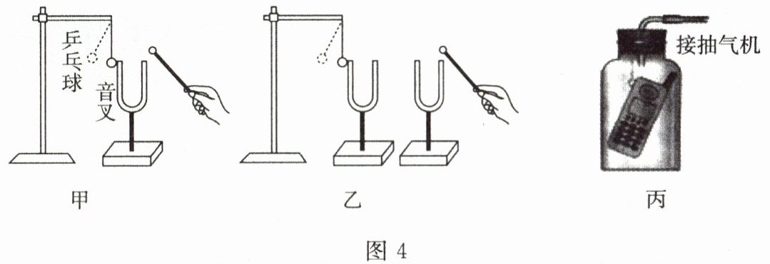 (4) 图丙是探究“声音的传播是否需要介质”的实验。把正在振动发声的手机放在瓶内,用抽气机将瓶中的空气逐渐抽出。