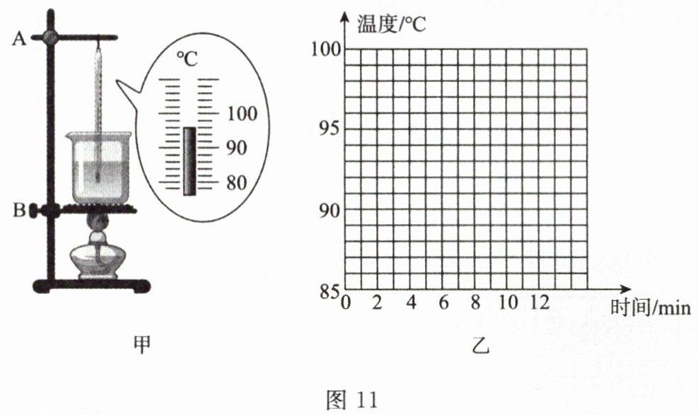 $^{\circ}C$。(2)根据表中实验数据,在图 11 乙中作出水的温度随时间的变化图像,由图像可知水的沸点是