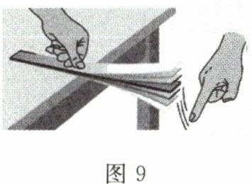 20. (6分)如图9所示,在“探究声音特性”的实验中,小明将塑料尺一端压在桌面上,另一端伸出桌面。