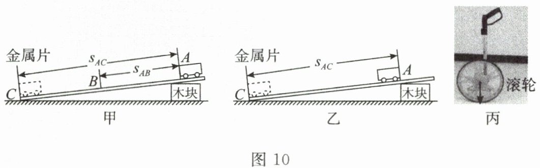 (选填“可”或“不可”)将小车从B点开始释放。(6)图10丙为测量长度的工具——滚尺,其主要由计数器和滚轮组成,滚轮由塑料轮毂和橡胶轮组成,将滚轮沿被测路径滚动时,通过滚轮滚动的圈数可以得出路径长度。小明利用滚尺测量自己的步行速度,推动滚尺同时计时,测出步行滚轮的圈数为n,所用时间为t,已知该滚尺滚轮直径为D,则小明步行的平均速度$v=$