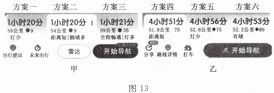 (2)小桂规划下次骑自行车前往,他用导航查询骑行路线,部分信息如图13乙所示。若他实际骑行的平均速度为10km/h,则他按导航方案四的路线到达目的地需要多长时间?