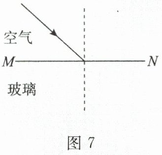 15. 如图7所示,一束光线从空气进入玻璃,在交界处同时发生反射和折射,请你作出反射光线,并画出折射光线的大致位置。