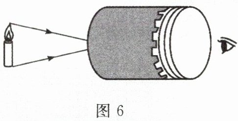 14. 如图6所示,用钉子在易拉罐底部的中央钻个小孔,将易拉罐的顶部剪去后,蒙上一层塑料薄膜,这样就制成了一个针孔照相机。将点燃的蜡烛置于小孔前的适当位置,观察并研究小孔成像的特点:蜡烛在塑料薄膜上所成的像是