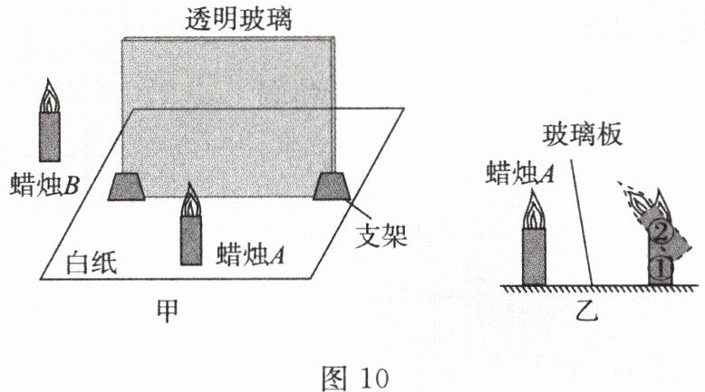 (选填“有”或“没有”)蜡烛 $A$ 的像。(5)若将玻璃板向左倾斜,如图10乙所示,观察到蜡烛 $A$ 的像的大致位置在图中的