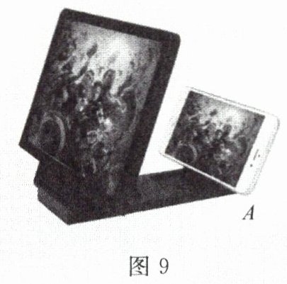 13. 一种屏幕放大器如图9所示,当把平板电脑或者手机放于$ A $处,从正前方看过去,画面就变大了。因为屏幕放大器前面的透明玻璃是一块巨大的