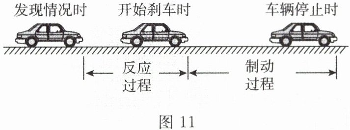 18. (11 分)汽车遇到意外情况时紧急停车要经历反应和制动两个过程,汽车在反应过程中做匀速直线运动,在制动过程中做变速直线运动,如图 11 所示。若汽车以 $20\ m/s$ 的速度在平直的公路上行驶,紧急停车时,在反应过程中汽车行驶了 $14\ m$,制动过程所用的时间为 $2.3\ s$。汽车在两个过程中通过的总距离为 $30\ m$。求: