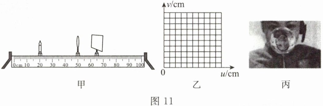 (1)实验中多次改变蜡烛与透镜的距离(物距 $ u $),同时移动光屏,让光屏上出现蜡烛清晰的像,并记下光屏到透镜的距离(像距 $ v $),数据记录如下表所示。请在图 11 乙中画出凸透镜成实像时的像距 $ v $ 和物距 $ u $ 的关系图像,由图像可知凸透镜的焦距是