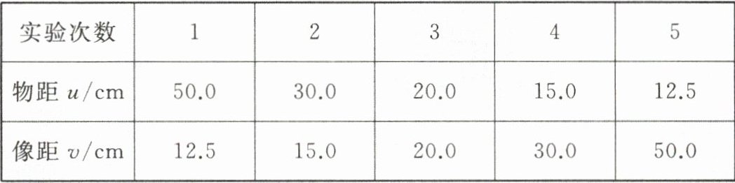 (1)根据表中数据描点,用光滑曲线连线,如答图10所示;当$u = v = 2f$时,凸透镜成倒立、等大的实像,此时$u = v = 20.0\ cm$,所以$f = 10.0\ cm$。