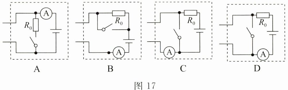(5)如图16丁为小明设计的“电阻测量盒”。盒内有电源(电压不变且未知)、阻值已知的定值电阻R₀、开关和电流表,并引出两根导线到盒外,他将盒外的两根导线分别与待测电阻Rₓ两端的接线柱相连,根据盒内开关闭合、断开时电流表的示数,便可以计算出Rₓ的阻值。图17中符合盒内电路设计要求的是
