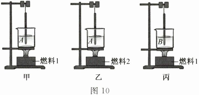 21. 物理实验小组的同学们组装了如图10所示的装置,在完全相同的烧杯中分别装有质量相同的A、B两种液体,在完全相同的燃料盒中分别装有两种不同的燃料。