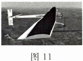 22. (8分)国际航空运输协会希望能在2050年实现飞行器的零碳排放,瑞士“阳光动力号”太阳能飞机(如图11)在这方面做出了大胆的尝试。该飞机的机翼承载200 m²的光伏电池面板,太阳辐射功率P约为$1.44×10^6 J/(m²·h)。$(太阳辐射功率是指1 h内辐射到1 m²面积上的太阳能)